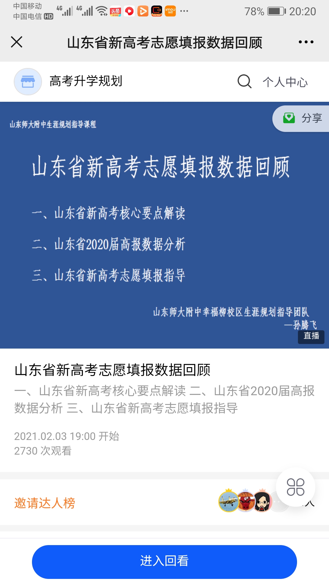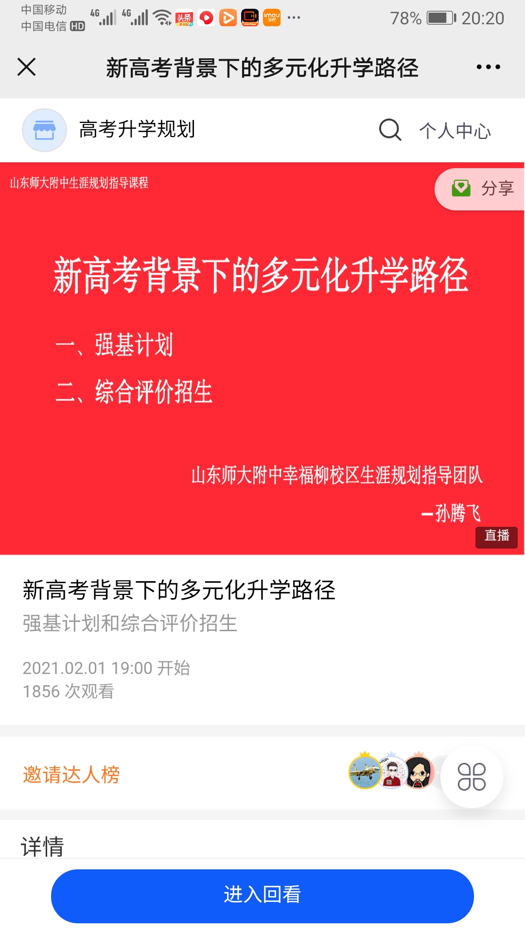 为适应新高考制度改革,让附中学子及家长提前接触高考升学制度,充分了解多元化升学路径,拓宽升学渠道,提高升学机会,山东师大附中幸福柳校区组建生涯规划指导团队,利用寒假时间线上直播生涯规划课程。2月1日至5日,团队老师通过线上为学生及家长分别作了《新高考背景下的多元化升学路径——强基计划和综合评价招生》《山东省新高考志愿填报数据回顾》《浅谈:新高考下,选科走班的新思路》系列讲座。