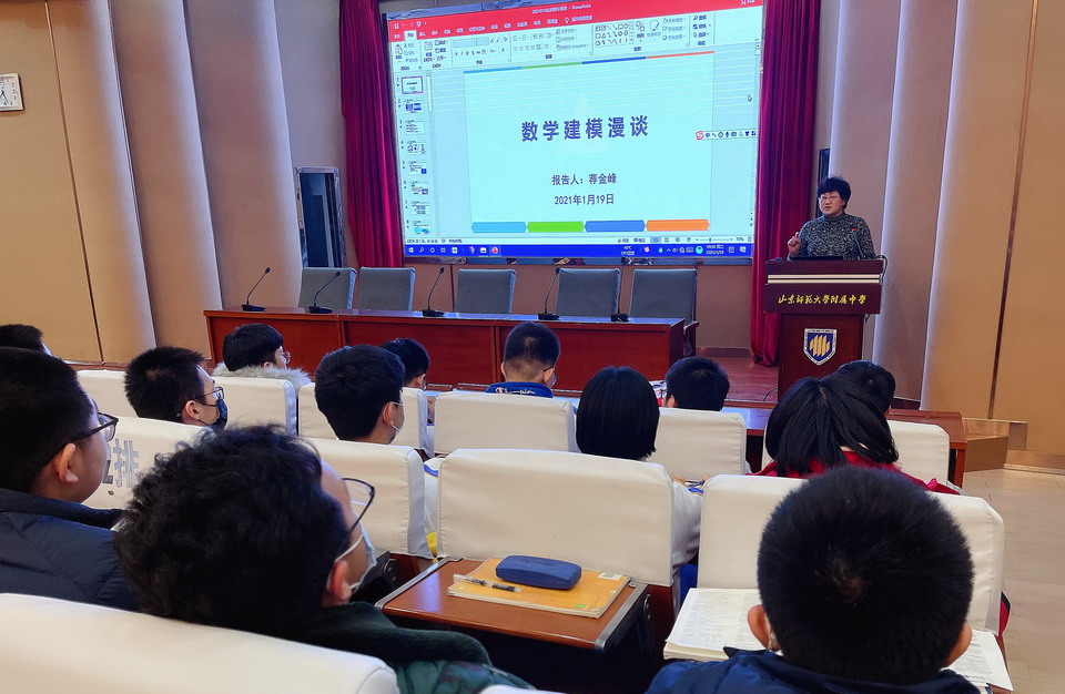 1月19日晚,山东师范大学数学科学学院荐金峰教授在山东师大附中校本部报告厅为山东师大附中学子开设《数学建模漫谈》为题的学术讲座。山东师大附中数学建模团队教师及本校区2020级学生聆听了讲座,讲座由山东师大附中数学教研组组长王秀梅主持。