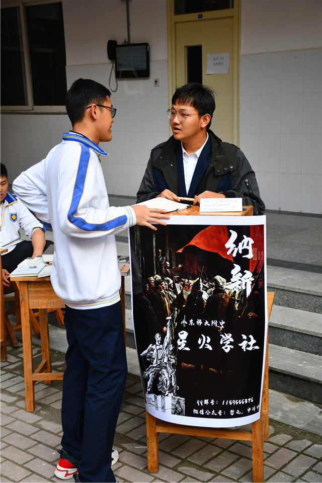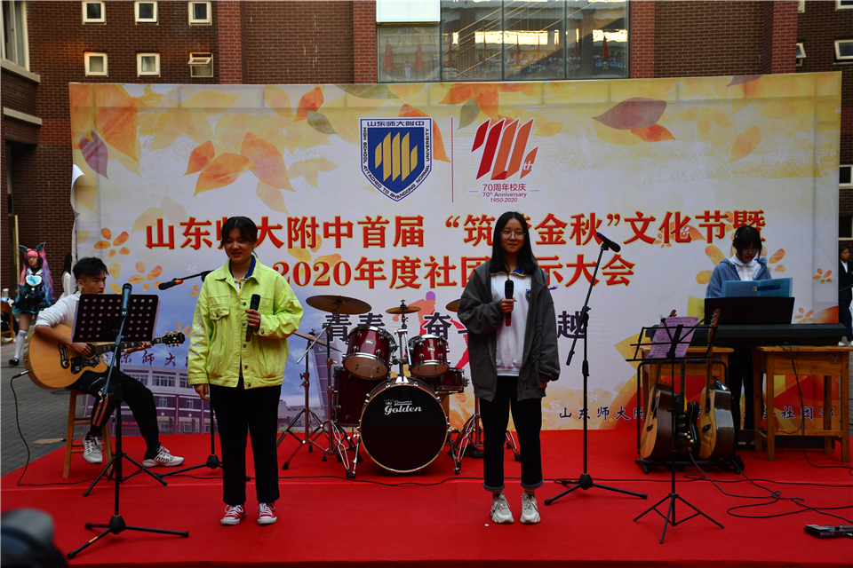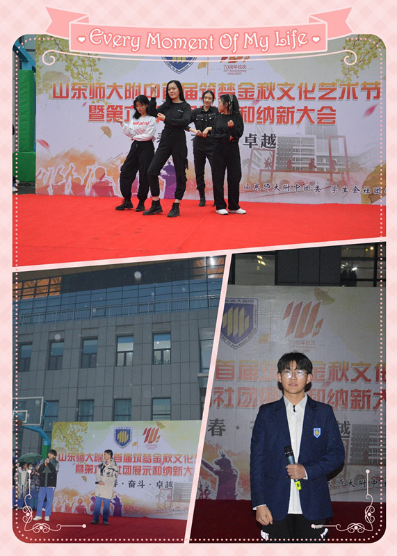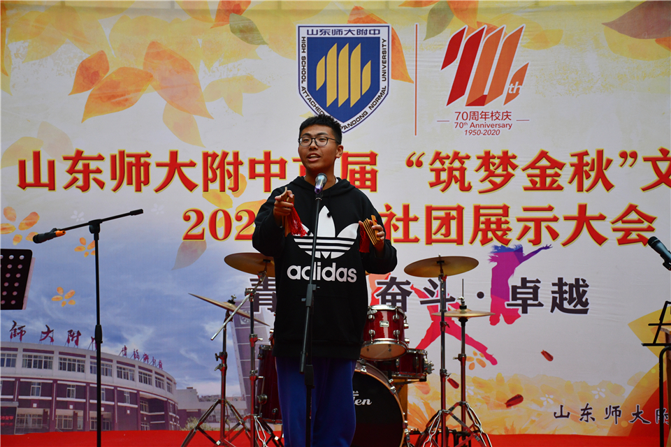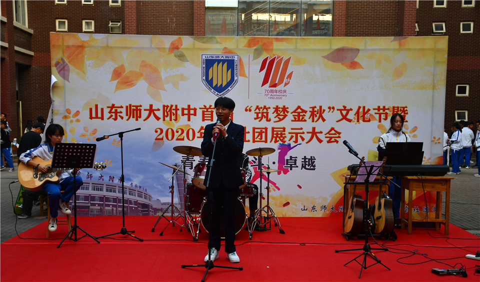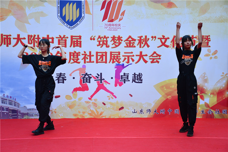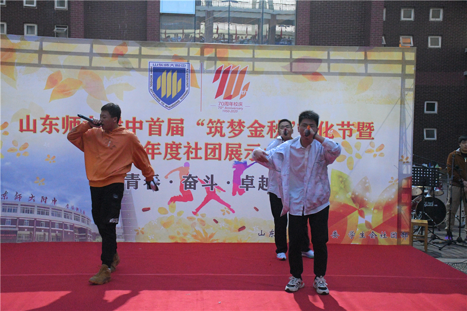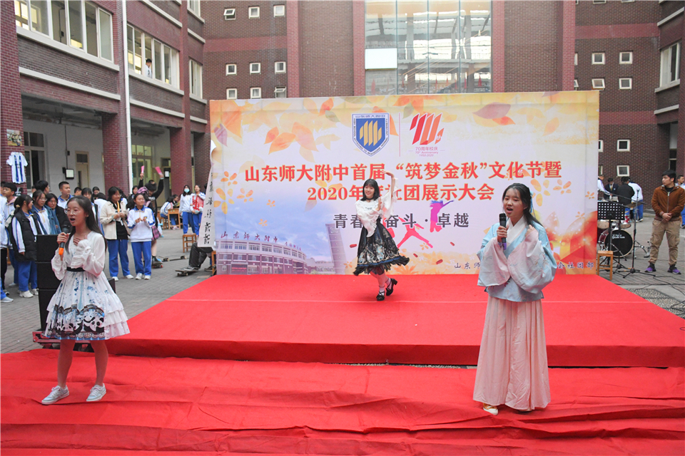 除了社团的专场演出,学校团委每个学期定期组织全校所有社团的纳新和展示大会。本学期,山东师大附中首届筑梦金秋文化艺术节暨第六届社团纳新和展示大会分别于11月5日在幸福柳校区、11月30日在校本部举办,两校区的学生社团纷纷上阵,节目精彩纷呈。校本部的戏剧社、街舞社、cospaly、足球社、篮球社等,分校区的跆拳道社、新文化乐器社、澄澈映水动漫社、说唱社、曲艺社、化学社、话剧社、书画社、书法社等众多社团都在学校提供的舞台上绽放着自己的青春和梦想……