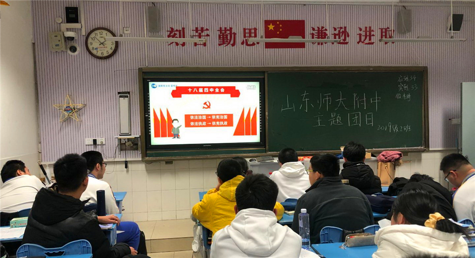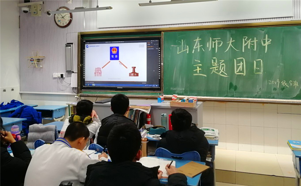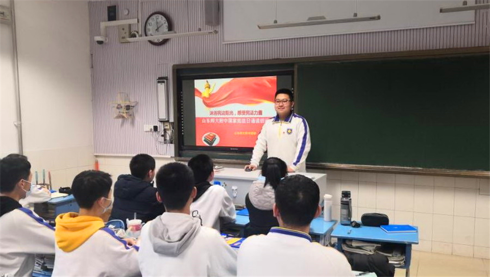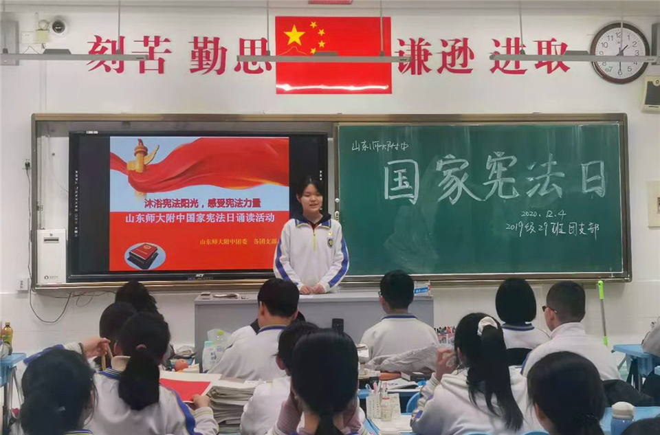12月4日,按照山东师大团委要求,山东师大附中团委结合学校实际情况,部署两校区各团支部同时开展宪法诵读活动,同学们在团支书的带领下诵读宪法的第一条、第二条等共九条宪法内容。铿锵昂扬的诵读声回荡在校园的每个教室,将整个校园衬托得更加庄严宏伟。伴随着声声朗读声,宪法的字字句句镌刻进每位附中青年学生的心头,大家油然生出对宪法无比的敬畏感。