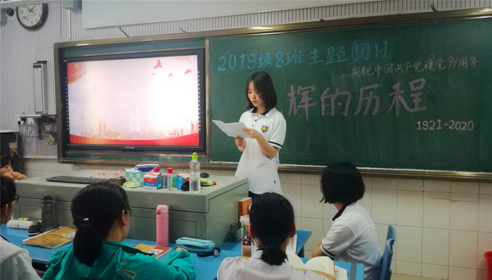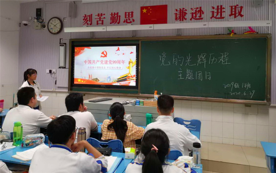 各班团支部书记按照学校团委的部署主持开展各班的主题团日活动。他们从党史的发展脉络及重大意义,党的历史给我们的三大启示,中国共产党的三大历史贡献,战疫情、始终牢记党的初心和使命四个角度组织同学们重温历史,畅谈现实。高一.1班团支书卢敏欣说:7月1日是党的99岁生日,这个时间是一段光辉岁月的印证,它警示着人们,党的成立来之不易;五星红旗飘扬,正是前辈们为我们用热血打造的和平岁月。高一.5班团支书高青果说:中国共产党和中国人民扎根中国大地、吸纳人类文明优秀成果、独立自主实现国家发展的战略是正确的,作为中学生,我们应当积极学习文化知识,助力国家每一步的发展,为国家、为社会贡献更多的青春热血。高一.13班团支书李骥轩、高二.24班团支书袁城琪等同学号召同学积极行动起来,用自己的拼搏和汗水,用自己的勤劳和智慧,为党的99岁生日献礼。