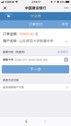 第五步:地区和类别分别依次选择“山东省”“济南市”“山东师范大学附属中学”,点击下一步,输入学生身份证号后查询应缴费金额。