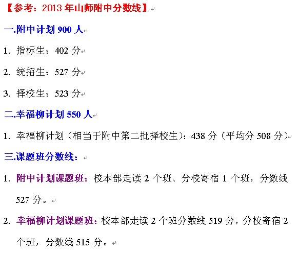 山东师大附中900人计划录满后,其他考生按分数由高到低依次录取550人,这550人就是幸福柳高中招生计划。