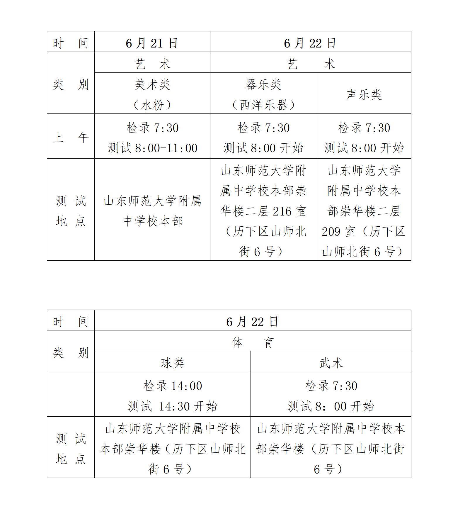 (三)报考山师附中计划及幸福柳计划美术、田径特长生的考生需参加济南市组织的美术、田径专业统一测试。美术考生还需参加我校校测。按照本人报考专项在规定时间内在网上进行报名、打印准考证、测试。具体安排请见招生简章美术、田径介绍。