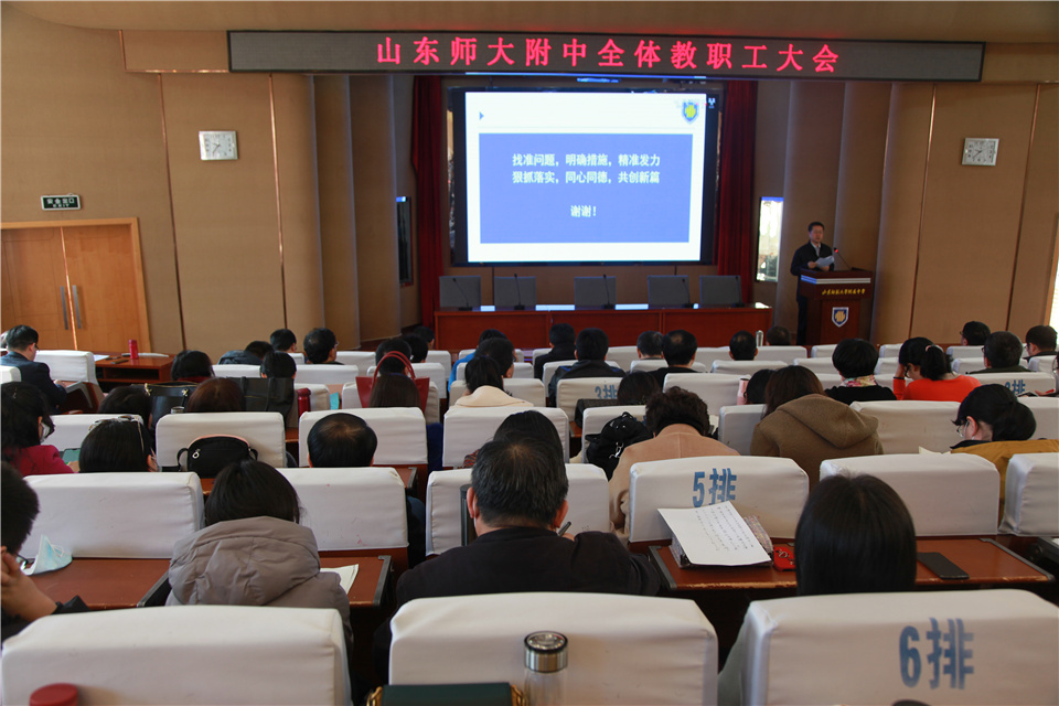 2月27日,山东师大附中在校本部报告厅举行全体教职工大会。全体教职工参加会议,党委书记孟宪喆主持会议。会议首先由两校区教务处主任李成金、张卫普对上学期三个年级期末统考情况进行了汇报,并对新学期教学工作提出工作要求。校长荆兆晶向全体教职工传达了学校2021年度工作计划。他从“履行党建工作职责、牢记使命创新发展”,“五育并举、全面提高育人质量”,“精益求精提质、探索特色发展之路”,“竭诚服务、为提升学校核...