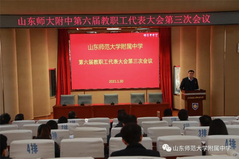 2021年1月30日上午,山东师范大学附属中学在校本部报告厅举行第六届教职工代表大会第三次会议。会议在雄壮的国歌中开幕,党委书记孟宪喆主持会议,全体教代会代表参会。会议首先听取审议了《山东师范大学附属中学“十四五“发展规划》。“十四五“发展规划是学校未来五年发展蓝图,也是统一全体教职工思想、凝聚力量的重要纲领性文件。党政办公室主任杨平就“十四五”发展规划起草情况进行说明。会议听取审议了《校本部综合楼和...