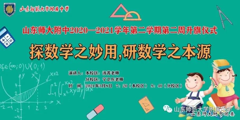 3月8日上午,山东师大附中正式启动第六届数学节活动。高二数学备课组组长汤菁、数学教研组副组长宁卫兵分别在校本部、幸福柳分校升旗仪式上,作了题为《探数学之妙用,研数学之本源》的主题发言,全校师生参加活动。为了纪念中国古代数学家祖冲之发现圆周率,国际数学协会于2011年将每年的3月14日设为国际数学节。山东师大附中数学节活动旨在搭建数学文化平台、展示数学研究魅力、提升学生的综合素质,是提高学生综合素养的一项...