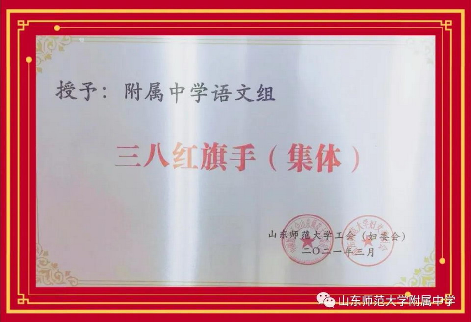 2021年3月8日,在全国人民同心同德共同抗疫的时刻,我们迎来了第111个“三八”国际妇女节,第98个“三八”中国妇女节。山东师范大学为表彰女教职工在工作岗位上做出的贡献和成绩,在组织推荐和评选的基础上,授予多名女教职工同志三八红旗手的荣誉称号。其中,山东师范大学附属中学孟伟老师获得“三八红旗手标兵”荣誉称号,王慧老师、宋梅老师和李雪梅老师获得“三八红旗手”荣誉称号。山东师范大学附属中学语文组获得“三八红...