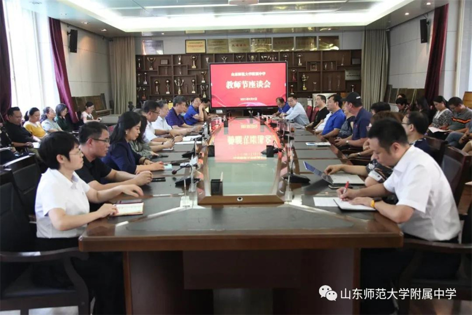 座谈会会场9月9日下午,山东师大附中两校区隆重举行庆祝第37个教师节座谈会。山东师大附中校长荆兆晶,党委书记孟宪喆,副校长陈德海,副校长、校本部执行校长刘从军,副校长、幸福柳分校执行校长杨仁勇和全体中层干部,从教三十周年教师、优秀教师代表、新入职教师及指导教师分别在两校区参加座谈会。两校区座谈会分别由执行校长助理刘明晖和王彬主持。座谈会上,荆兆晶、孟宪喆为陈德海、曹秋菊、邹朝权、马莲媛、李青霞、...
