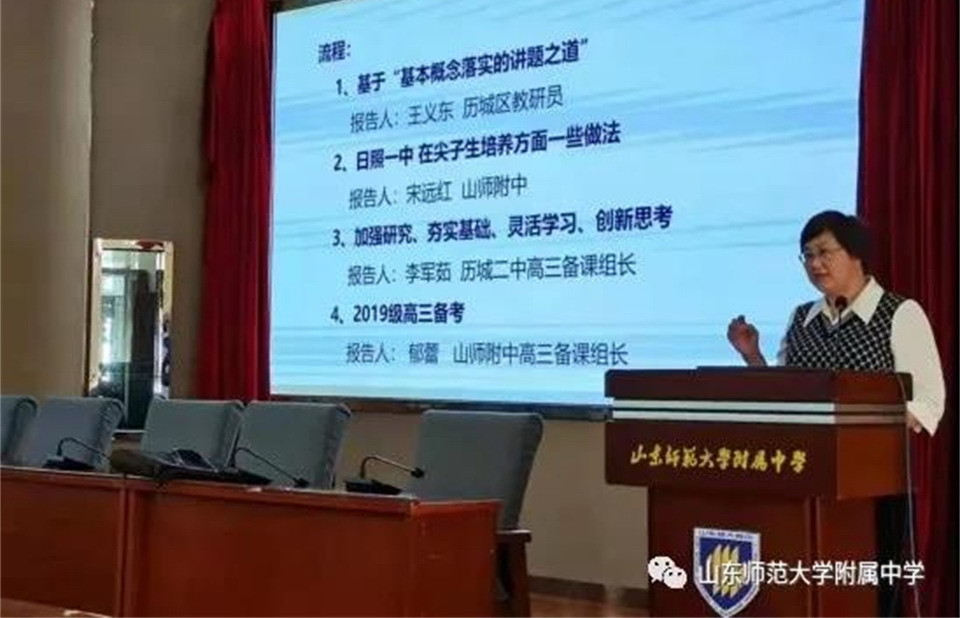 数学组教研组长王秀梅主持为进一步提升教师专业技术水平,深化课程改革,改进教学方法,拓展教研渠道, 9月8日下午,历城二中、山师附中数学组联合教研活动在山师附中校本部报告厅举行。济南市教育教学研究院数学教研员安学保、历城区教研员王义东、历城二中教科处主任、数学教研组长张治国、备课组长李军茹、张成凯,历城五中数学教研组长袁停位、备课组长胡晓庆和山师附中数学组全体教师参加活动。山师大附中数学教研组组长...