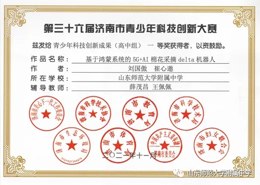 2021年12月,第36届济南市青少年科技创新大赛圆满结束,山东师大附中学生刘国傲、刘元康、肖怡诺同学获得青少年科技创新成果一等奖,沈子栋、苏颐欣获得二等奖;董一麟、邓森分获科技创意一等奖、 二等奖,是济南市高中获奖最多的学校。2021级6班学生刘国傲科技创新作品《基于鸿蒙系统的5G+AI棉花采摘delta机器人》获得高中组科技创新成果一等奖位次第一名;2020级5班刘元康科技创新作品《基于YoloV5深度学习算法的手势识别电风...