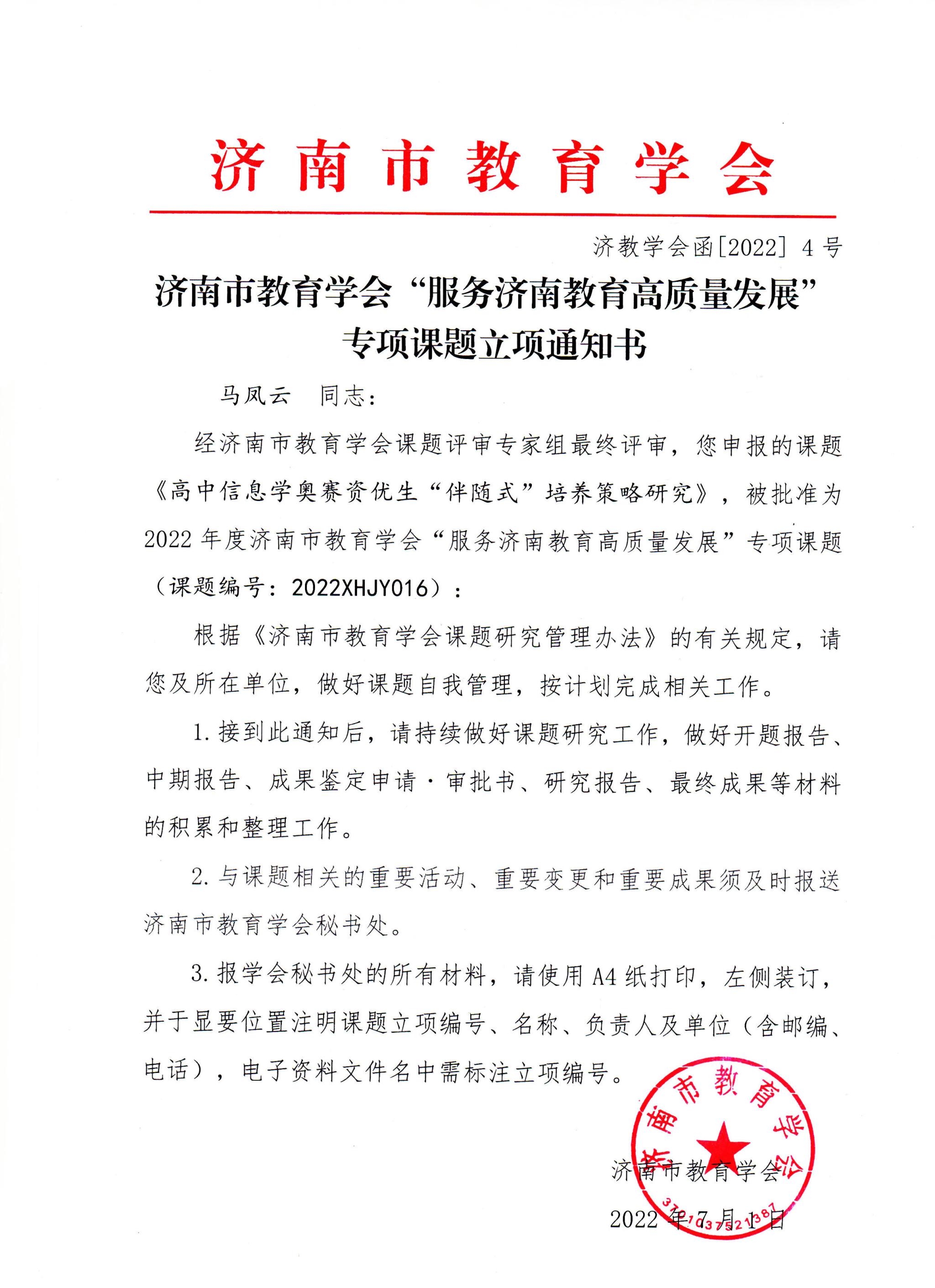 近日,接济教学会函[2022] 4号通知,经济南市教育学会课题评审专家组评审,山东师大附中信息技术组高级教师、信息学竞赛主教练马凤云老师申报的课题“高中信息学奥赛资优生‘伴随式’培养策略研究”,被批准为 2022年度济南市教育学会“服务济南教育高质量发展”专项课题(课题编号:2022XHJY016)。本课题主要采用行动研究范式,根据山东师大附中信息学奥赛伴随式培养教学的现状以及线上和线下教学的特点,以高一学生为重点研...